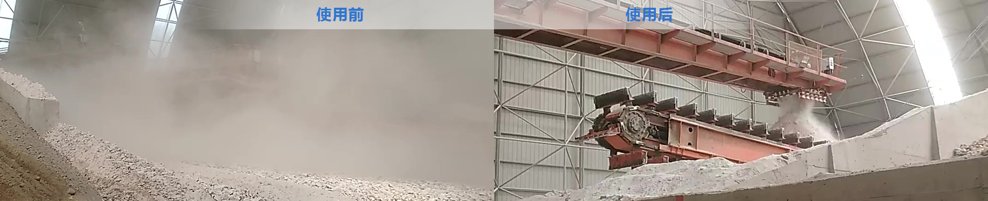 通過水轉(zhuǎn)接裝置/水箱/滑線等,向堆料機(jī)進(jìn)行水/氣輸送,使干霧在堆料機(jī)進(jìn)、出料端形成霧幕,達(dá)到對(duì)1-100μm粉塵的有效抑制。